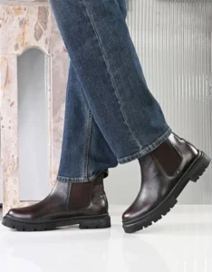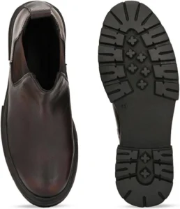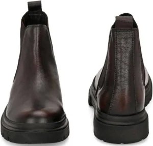A pair of brown chelsea boots, has mid-top ankle and slip-on fastening and back detail